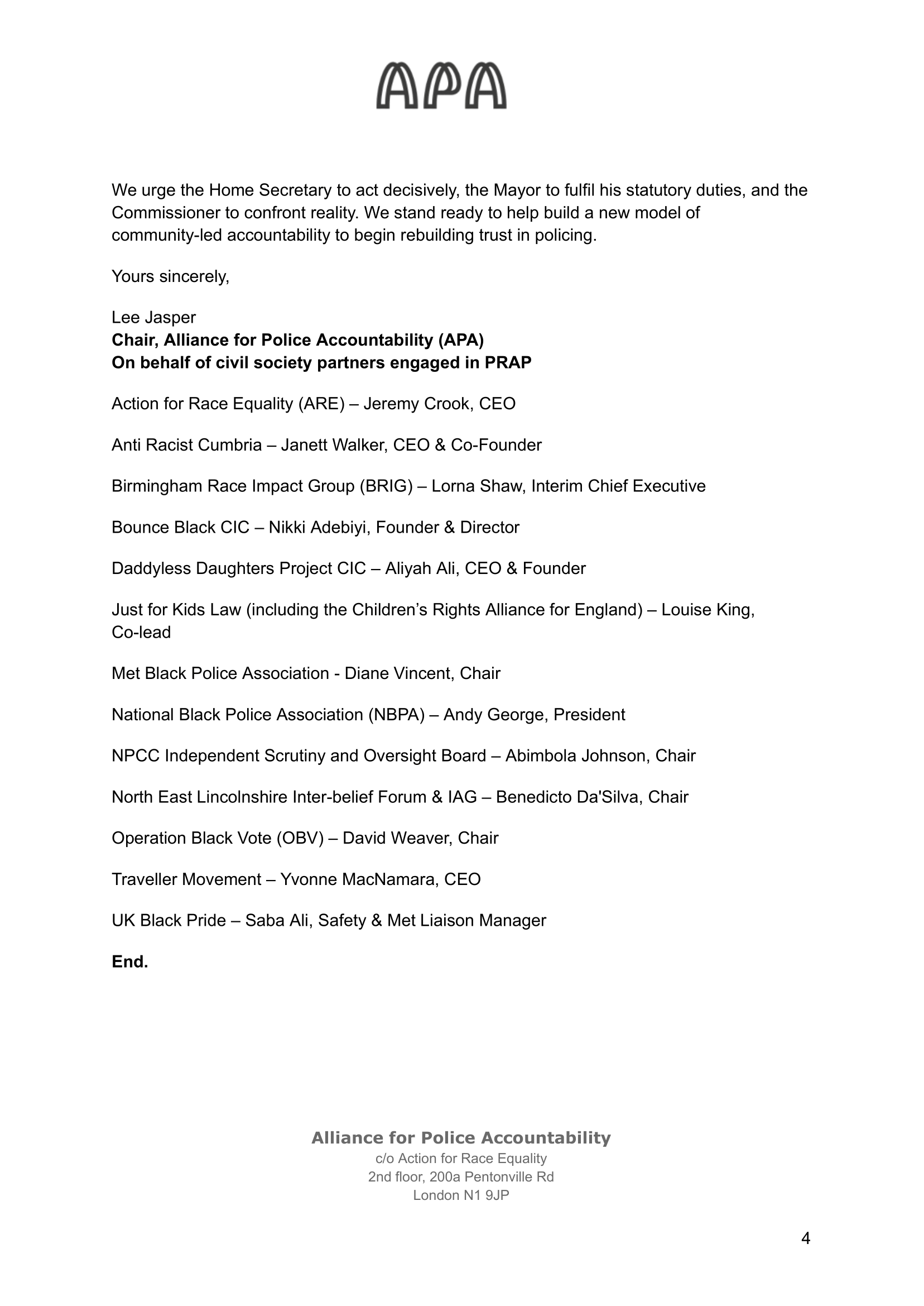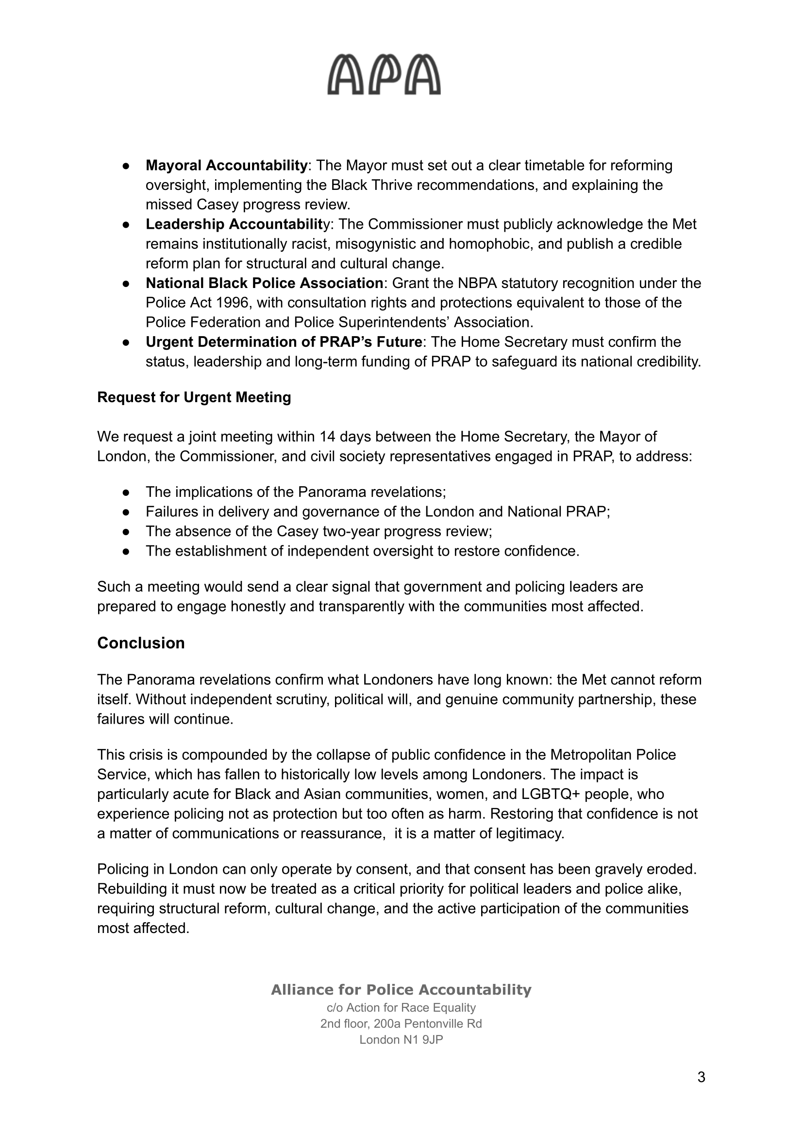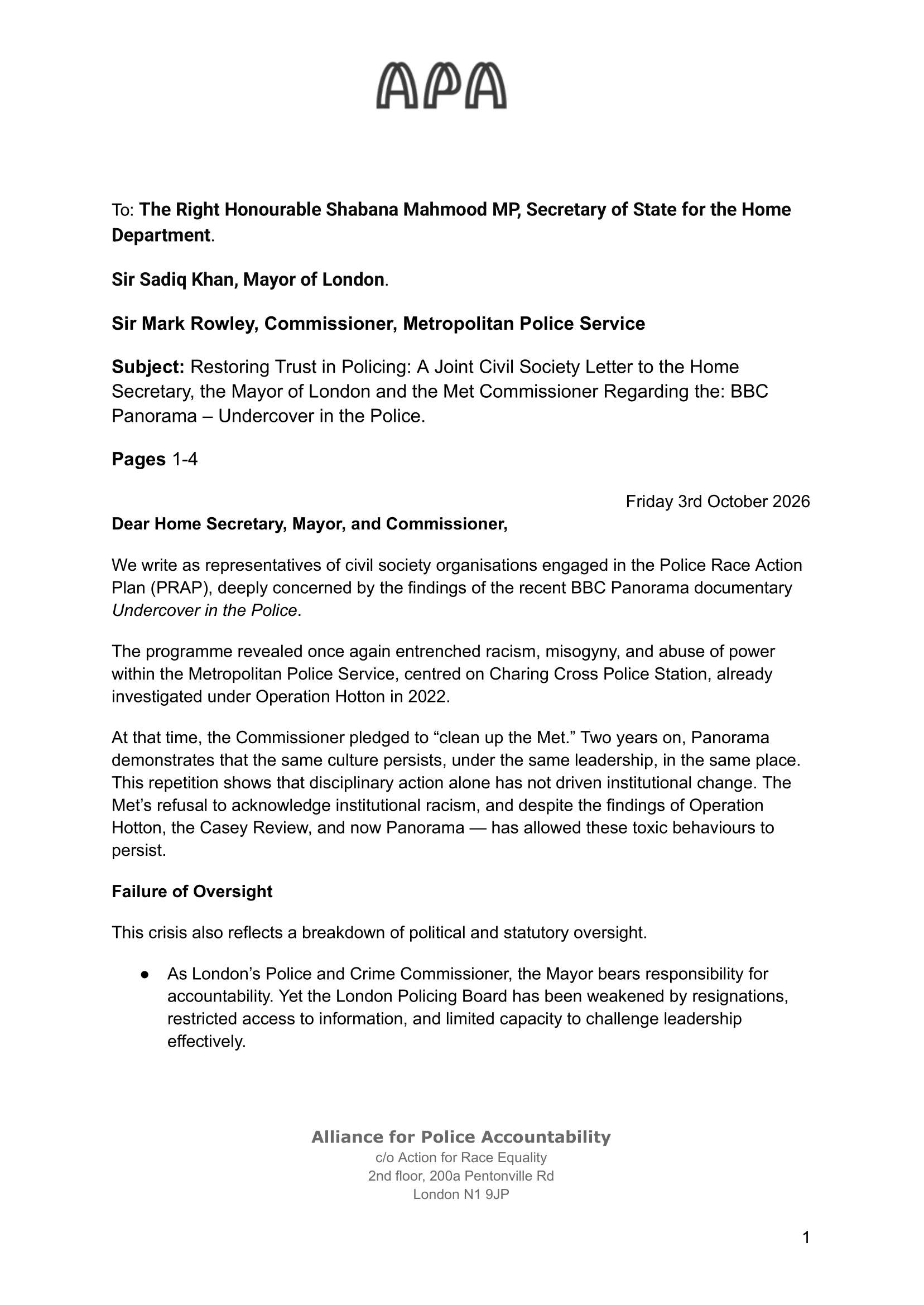 This is why I signed the joint letter to the Home Secretary, the Mayor of London and the Metropolitan Police Commissioner. Alongside our civil society partners in the Alliance for Police Accountability (APA), we are calling for urgent, structural change. The letter makes clear that policing cannot continue on its current path: oversight has failed, accountability has collapsed, and leadership is refusing to confront the reality of institutional racism.